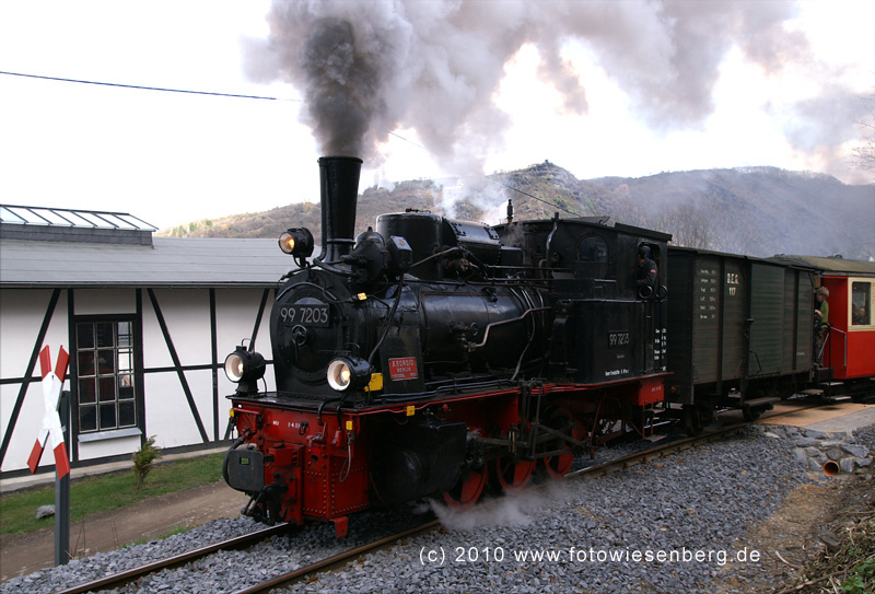 99 7203 bei der ausfahrt aus dem brohler bahnhofsgelände